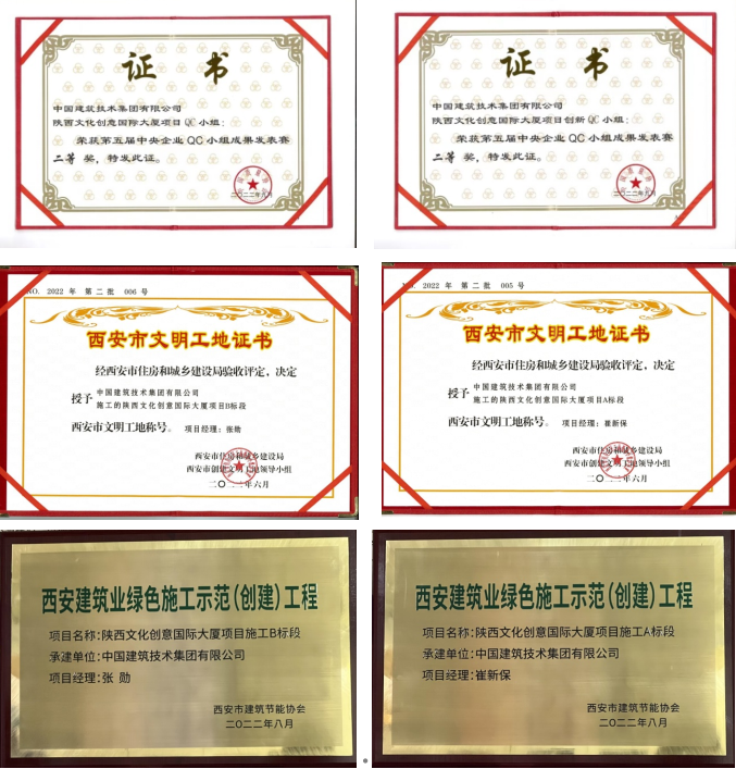 此前,陜西文化創意國際大廈項目QC小組曾在第四屆中央企業QC小組成果發表賽中榮獲三等獎。兩年間,小組成員共計完成4項課題,并在西安市發表賽中斬獲一等獎3項、二等獎1項。在QC小組驅動下,文創項目也積極評優,相繼榮獲“西安市文明工地”“西安建筑業綠色施工示范工程”等多項獎項。