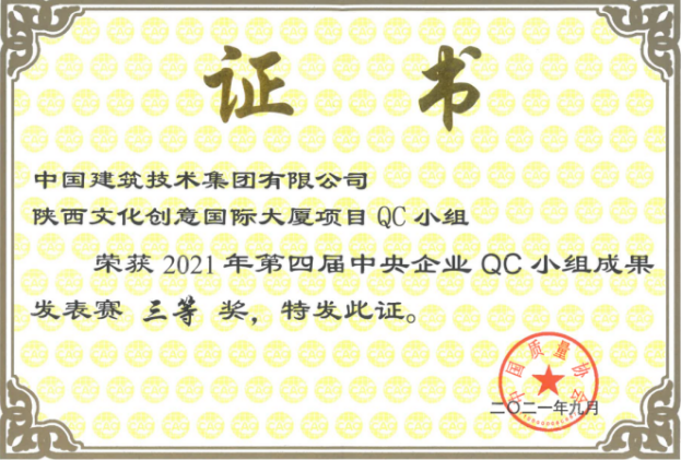 ? 近日,由中國質量協會主辦的第四屆中央企業QC小組成果評選發表賽圓滿結束。中國建筑技術集團有限公司西北分公司憑借陜西文化創意國際大廈項目QC小組《提高疊合板安裝合格率》課題榮獲三等獎。