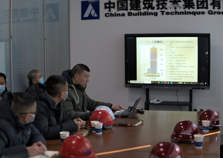 中技集團第二工程分公司副總經理韓玉文對鼎興大廈工程裝修項目概況和項目生產進度情況進行了匯報,中國建研院和中技集團領導一行詳細了解了項目特色、施工進度、安全管理及質量管控情況,并對項目部目前的整體管理給予肯定,同時就項目建設、安全生產、疫情防控等重點工作提出要求。
