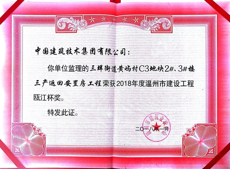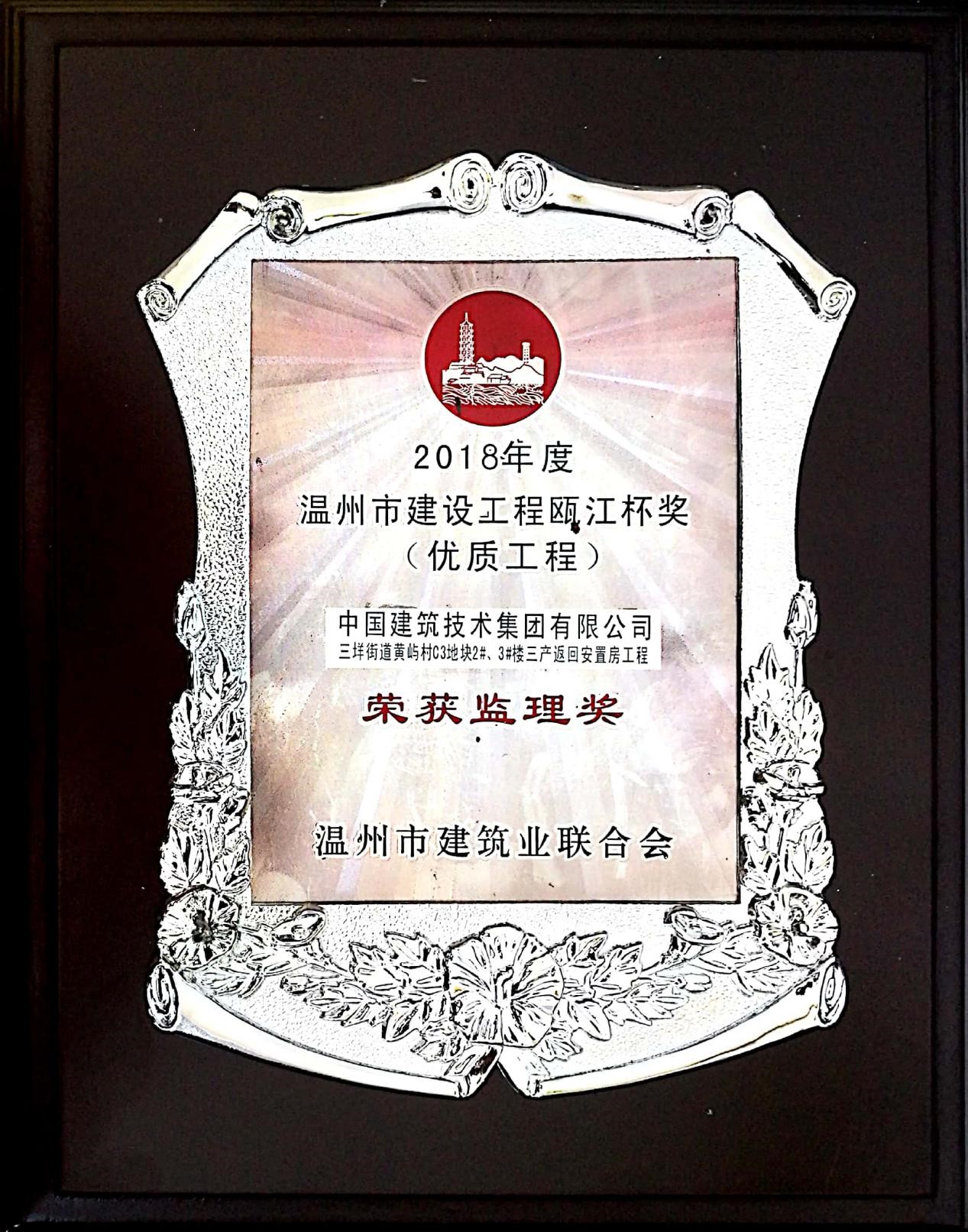 ? ? ? ?近日,溫州住建委、溫州市建筑業聯合會召開表彰大會。溫州分公司承攬的“溫州市三垟街道黃嶼村C3地塊2#3#樓三產返回安置房”工程監理項目榮獲2018年度溫州市優質工程“甌江杯”獎。?