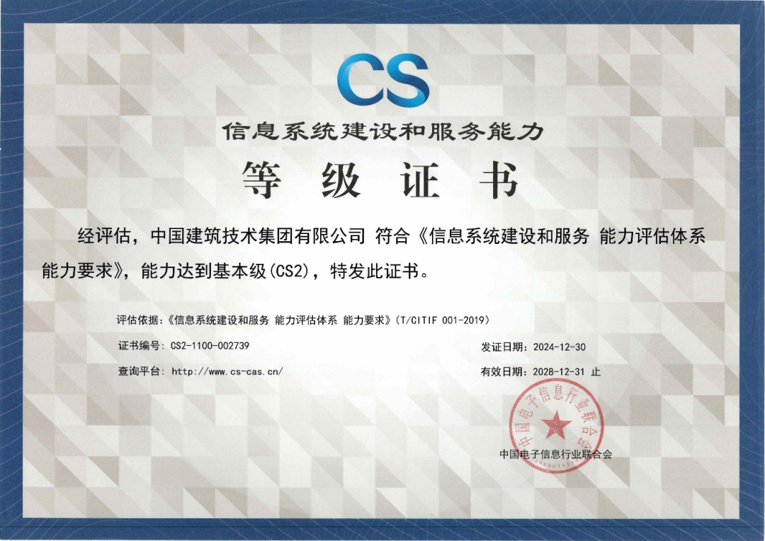 此次CS2認證的獲得,是對中國建技在信息系統建設和服務領域專業實力的肯定。中國建技將以此為基礎,在數字化、智能化方面持續發力,持續輸出“智筑美麗城鄉”信息化解決方案,進一步提升企業數字化、信息化體系建設水平,助力各行業數字化轉型升級,為推動建筑行業數字化轉型高質量發展貢獻央企智慧與力量。