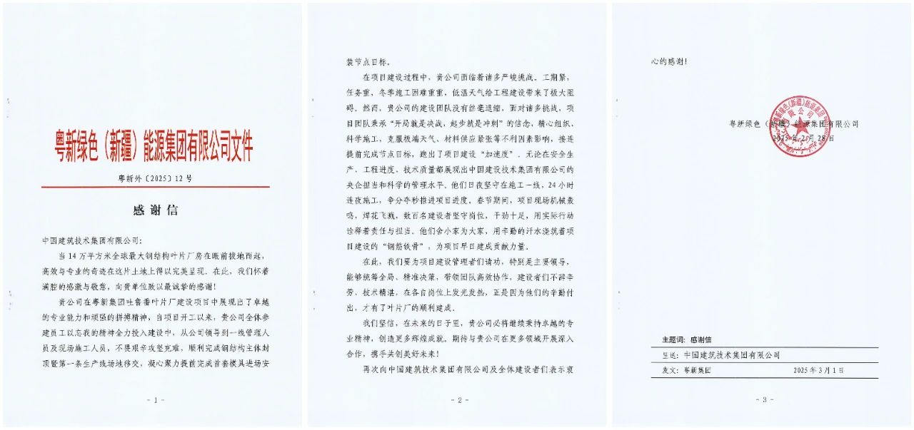 近日,中國建技收到明陽智慧能源粵新綠色(新疆)能源集團(tuán)有限公司發(fā)來的感謝信。對中國建技在14萬平米的全球最大鋼結(jié)構(gòu)葉片廠房——吐魯番葉片廠房項(xiàng)目建設(shè)過程中的優(yōu)異表現(xiàn),給予了充分肯定和真摯感謝。