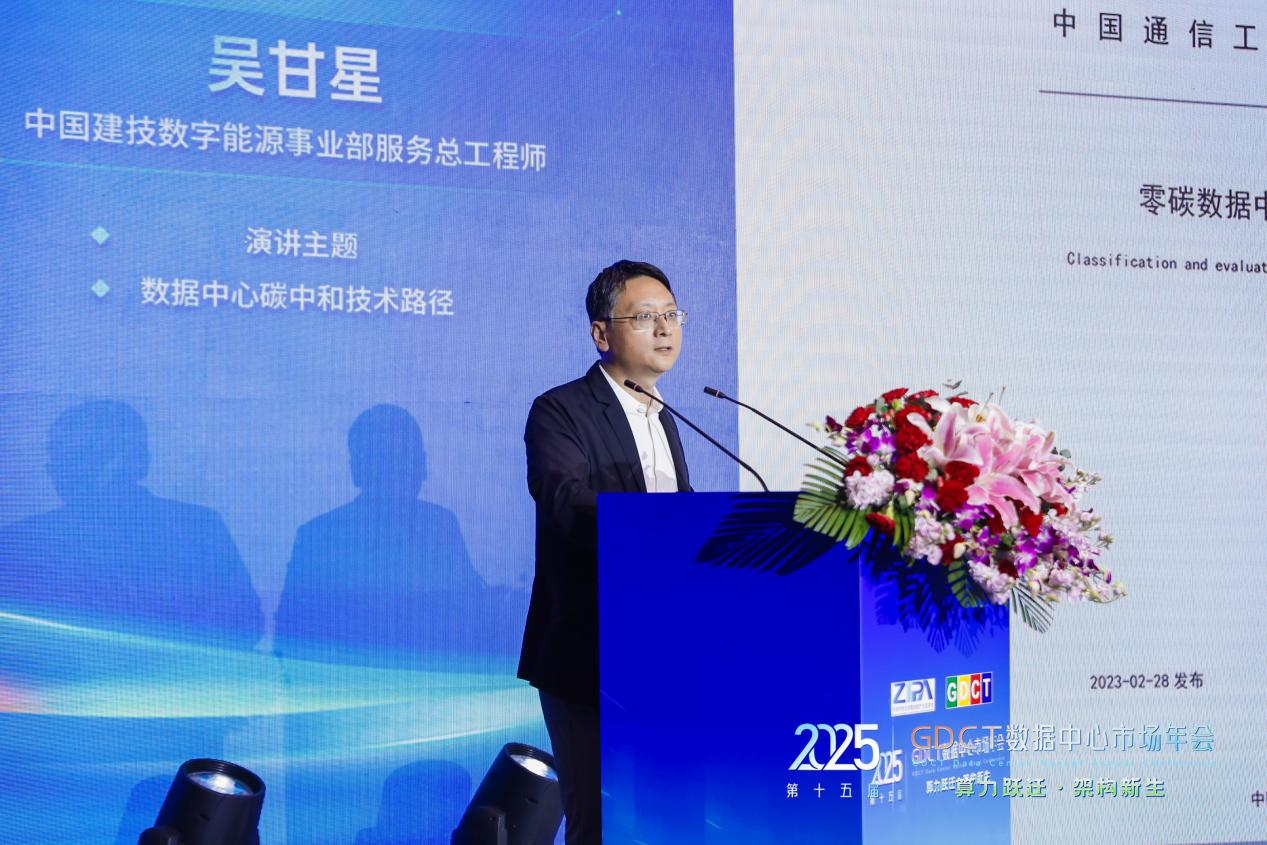 中國建技數字能源事業部服務總工程師吳甘星分享了主題為《數據中心碳中和技術路徑》的主旨演講,系統闡釋了數據中心碳足跡分析方法及碳中和技術路線,提出“能源側清潔化、用能側高效化、管理側智能化”的三角支撐體系,并分享了中國建技在碳中領域的科研創新成果和工程實踐經驗。