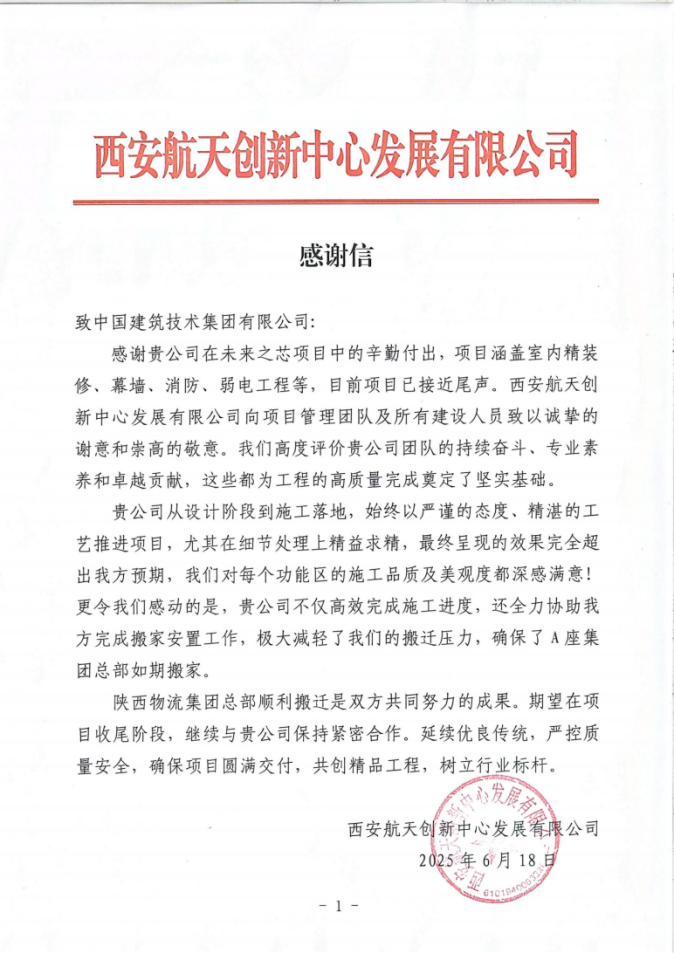 近日,中國建技收到西安航天創新中心發展有限公司(以下簡稱“西安航發”)發來的感謝信。對中國建技在西安“未來之芯”項目團隊展現出的專業素養、高效協作以及卓越的項目管理能力給予高度贊揚。