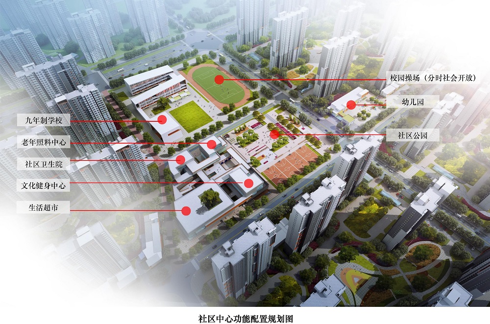 將生活超市、文化娛樂(lè)、全民健身、社區(qū)醫(yī)療、老年照料、九年制學(xué)校、社區(qū)公園、幼兒園和管理服務(wù)等社區(qū)類級(jí)的公共設(shè)施相對(duì)集中或鄰近布局,實(shí)現(xiàn)了便利化使用和規(guī)模化經(jīng)營(yíng)的雙重目標(biāo)。規(guī)劃同時(shí)兼顧設(shè)施抗擾和共享平衡的問(wèn)題:醫(yī)療、養(yǎng)老相互結(jié)合,教學(xué)設(shè)施相對(duì)獨(dú)立,學(xué)校操場(chǎng)臨近社區(qū)公園和文體中心布置,方便對(duì)外開放和聯(lián)動(dòng)使用。