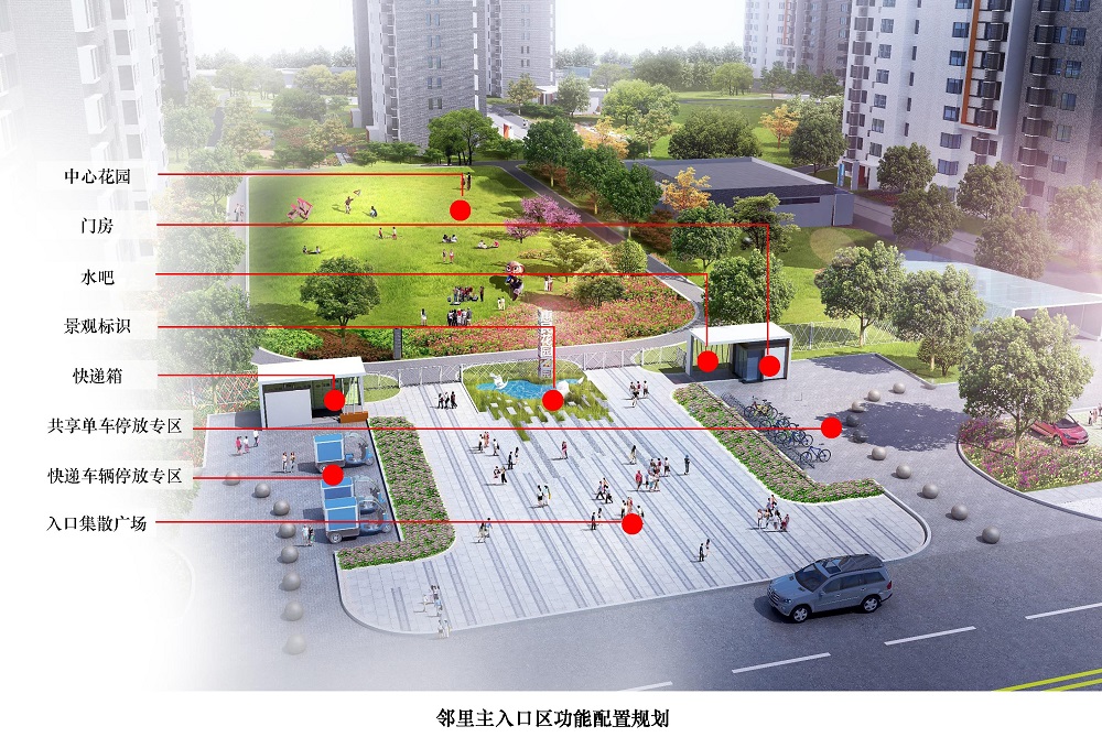 主入口實(shí)行人車分流組織,設(shè)置集散廣場(chǎng)、景觀標(biāo)識(shí)和中心花園。精細(xì)化布局門房、快遞箱、水吧、共享單車與快遞車輛停放專區(qū),形成功能強(qiáng)大的新型住區(qū)入口服務(wù)系統(tǒng)。