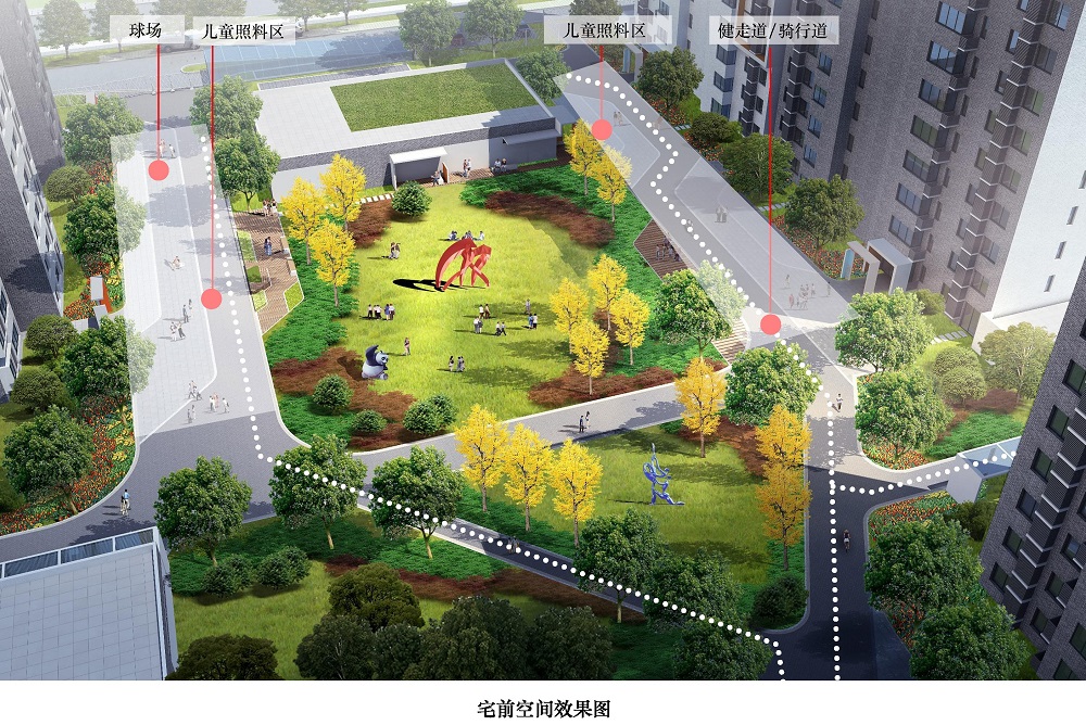 利用宅前消防登高場(chǎng)地規(guī)劃打球、健走、騎行和兒童照料等內(nèi)容,將宅前空間作為單元住戶的交往活力場(chǎng)所?;顒?dòng)場(chǎng)地外擴(kuò),結(jié)合綠化布置休閑座椅、花池廊架和文化藝術(shù)裝置,合理布局自行車棚、信報(bào)箱、垃圾收集箱和配電室等項(xiàng)設(shè)施。單元樓門設(shè)置入口標(biāo)識(shí)和門禁,居民活動(dòng)也能對(duì)樓宇安全發(fā)揮良好的監(jiān)控作用。
