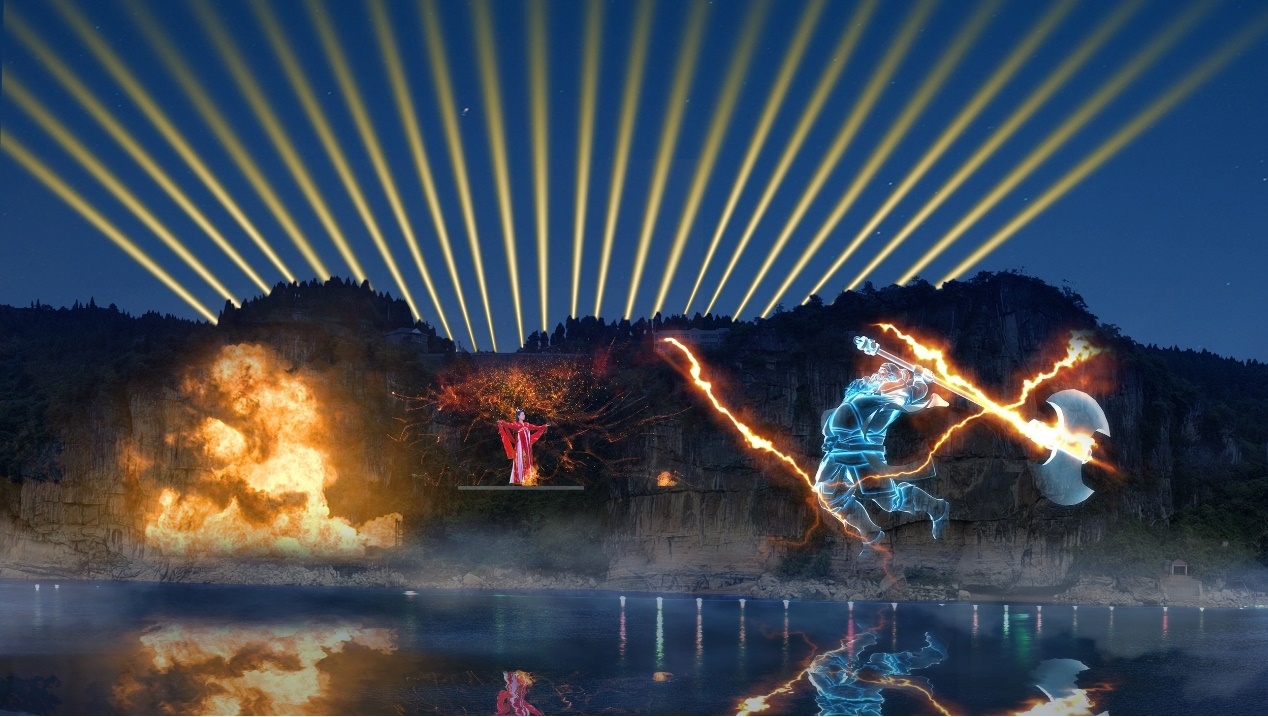崖壁5D燈光秀尤為新穎,采用“崖壁投影+舞臺演繹”的方式,以兩側崖壁為投影載體,中間布置小舞臺配合燈光矩陣,將辛女與盤瓠的凄美愛情故事和妖怪來襲國破山河場面,將軍點兵出征的戲劇場面演繹得活靈活現。