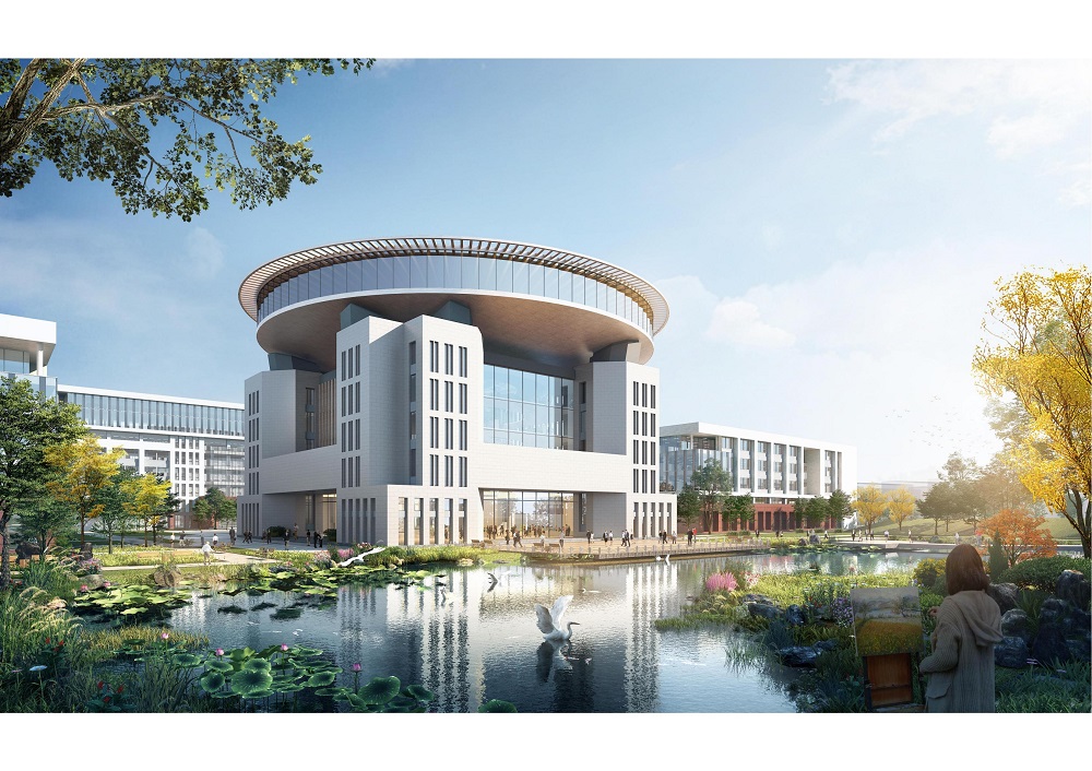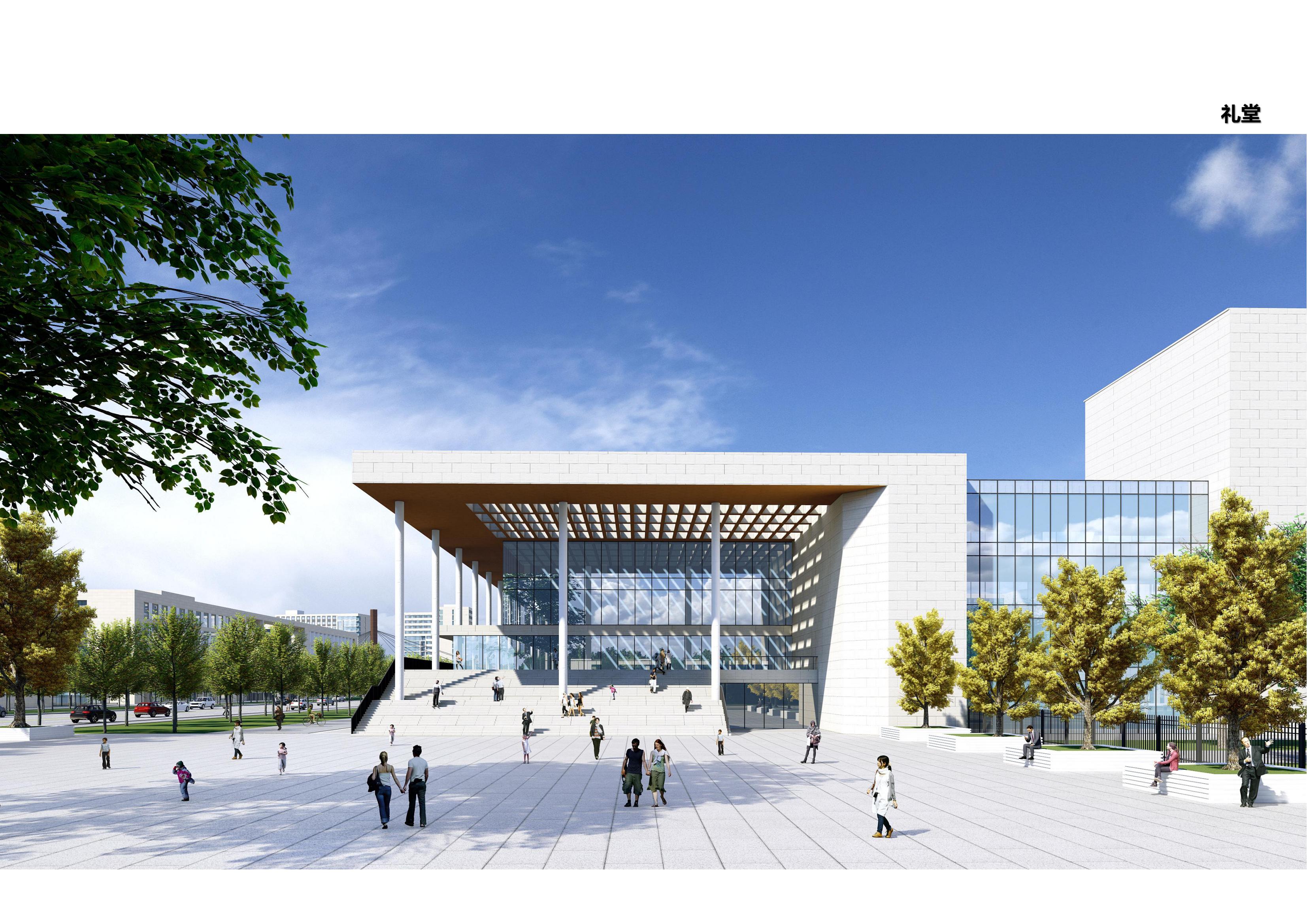 項目核心文化建筑:圖書館與圖書綜合樓,采用左右對仗形式設置于東西校區(qū)中心位置。圖書綜合樓以“圓”為頂;圖書館以“方”為體,體現(xiàn)“天圓地方” 的中國傳統(tǒng)宇宙觀 。