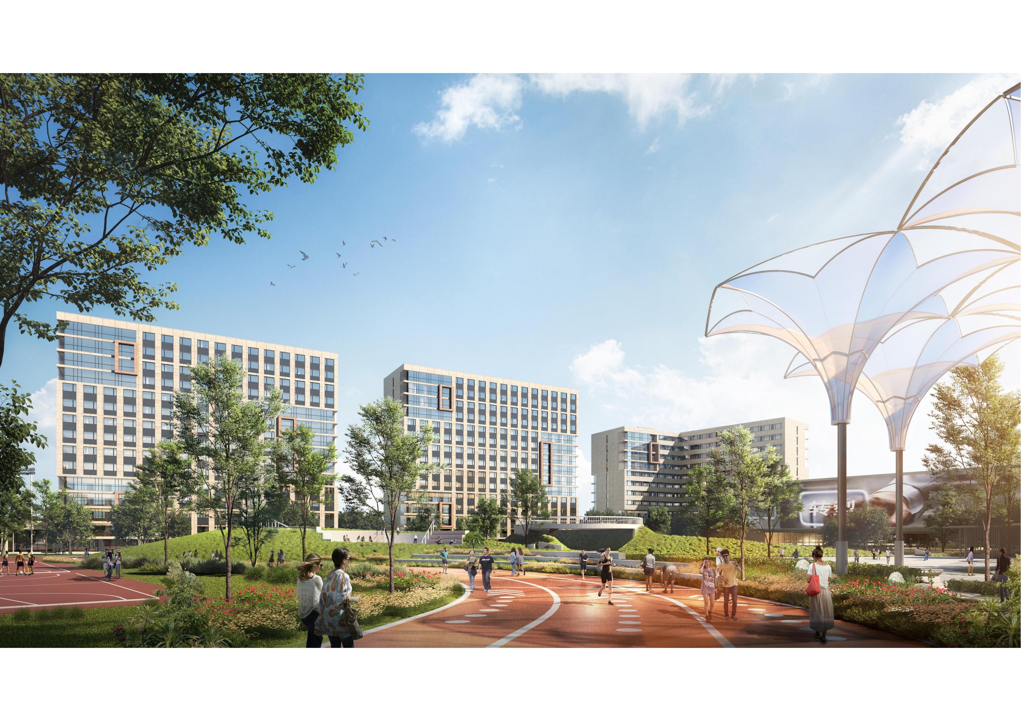 生活區(qū)景觀以“玉如意”為意向,勾勒出學生活動場地、體育運動場地、集會休閑場地等形象,連接東西地塊,營造了活潑怡人的生活氛圍。